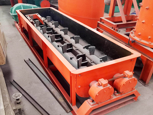 由二組螺旋葉片機均勻供料進入主機,把進入混料槽、攪拌槽的干灰粉狀物料由給水裝置定量供給的水進行強制混合、攪拌,同時將符合濕度要求的物料輸送至出料口排出。